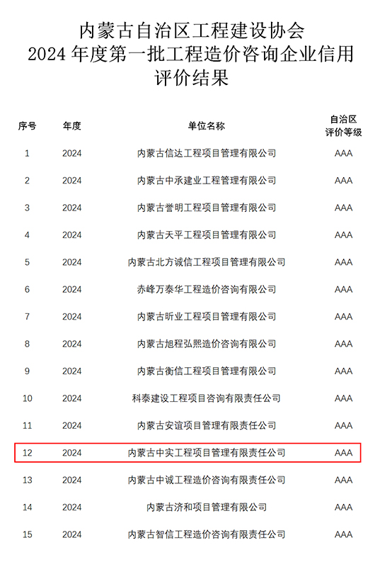 2024-07-3017085 次近期,我公司参加内蒙古自治区工程建设协会组织的“2024年度第一批工程造价咨询企业信用”申报,获得“信用AAA级证书”。我公司成立多年以来,遵循中国工程造价管理协会对造价咨询企…